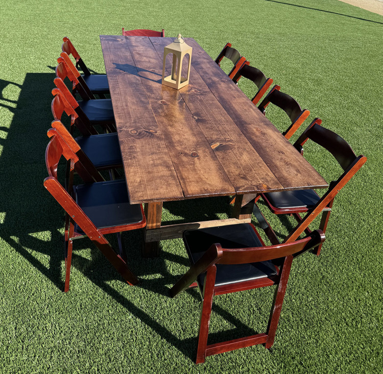 Elevate your next event with our stunning 8ft farm tables, available for rent throughout the Coachella Valley. Crafted from solid wood with a rich, rustic finish, these tables bring timeless charm and warmth to weddings, parties, corporate gatherings, and outdoor celebrations.